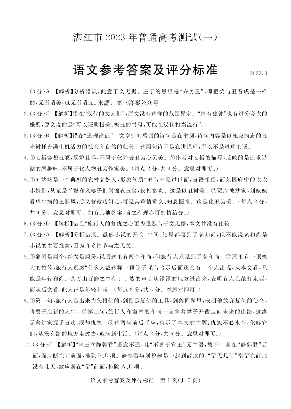 以上内容为湛江一模2023年普通高考测试(一)语文参考答案详情,请关注大试题网为广大考生提供的其它相关内容。