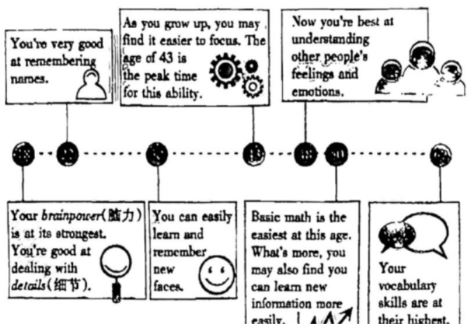 It's believed that people reach their mental peak(顶峰)in their 20s. However,this isn't completely true. According to a recent study by scientists from the Massachusetts Institute of Technology in the US, people are best at doing different things at different ages.They studied many people aged 10 to 90 years old, who were asked to take part in different memory tests.