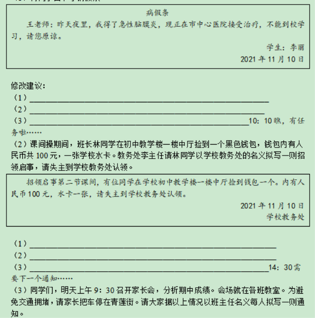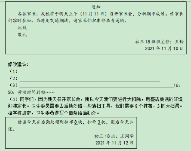 4.依照下列情景剧,从格式或者内容方面给下列应用文提出修改建议。(13分)