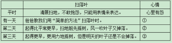 15.“我们”每次扫落叶心情都是不同的,请根据原文完成下列表格。(3分)