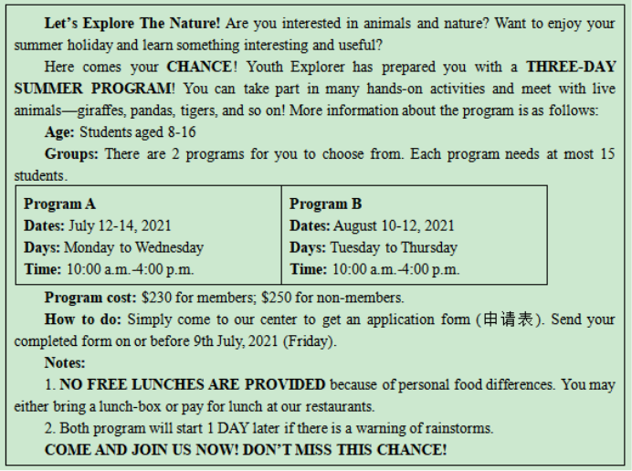 D) 在录音中, 你将听到一篇短文,短文后有五个小题,从每小题A、B、C中选出能回答所给问题的正确答案。短文读两遍。(听短文前,你将有40秒钟的读题时间;听完后,你将有40秒钟的答题时间)