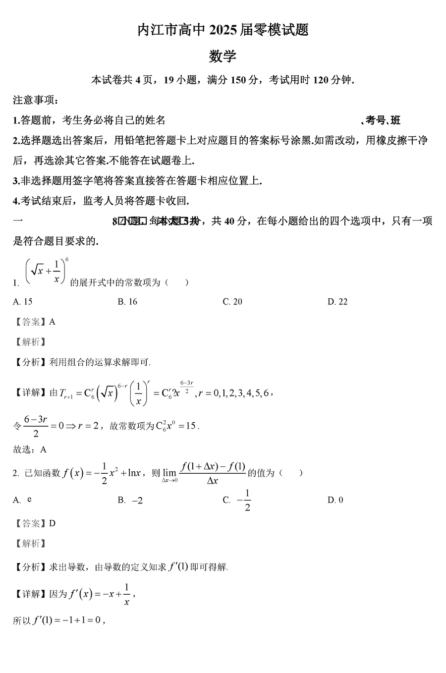 2025届四川内江高三上学期零模数学试题质量较高,题型多样,将作为考察考生对相应考点的掌握程度,考后将及时整理试题及答案解析相关信息,以供考生学习交流!