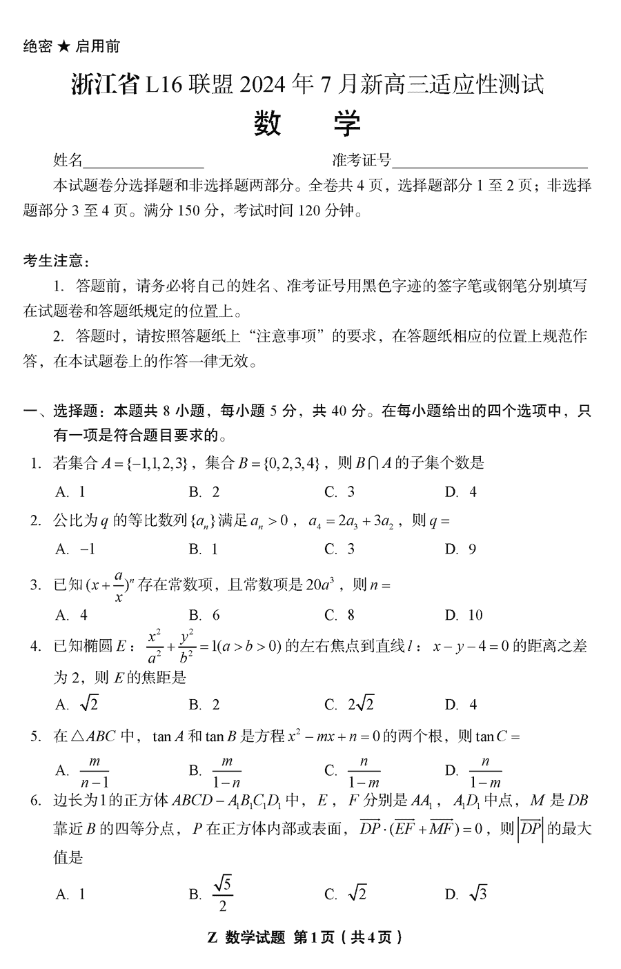 浙江省强基联盟2025届高三下学期5月联考数学试题质量较高,题型多样,将作为考察考生对相应考点的掌握程度,考后将及时整理...