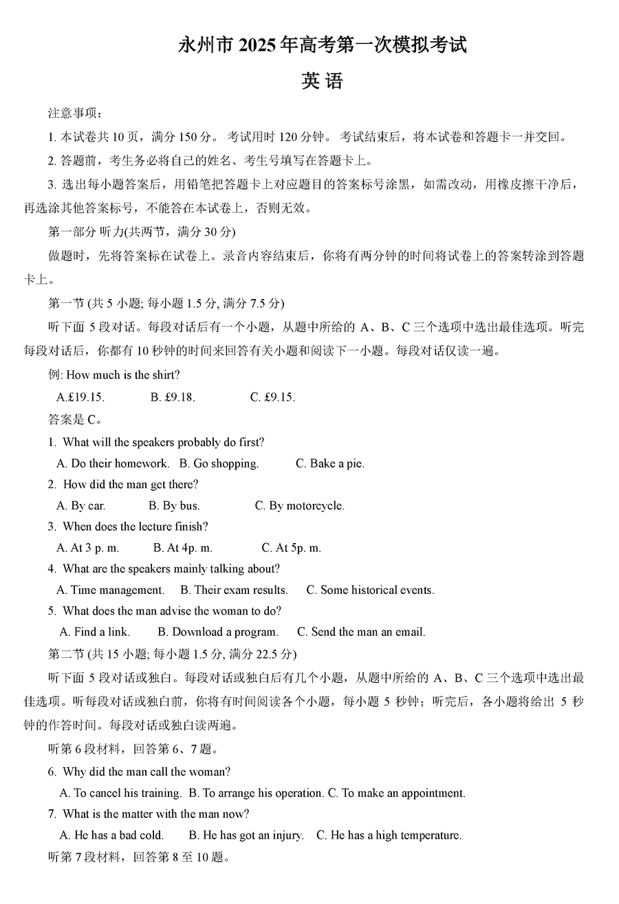 湖南永州2024-2025学年高三上学期一模英语试题质量较高,题型多样,将作为考察考生对相应考点的掌握程度,考后将及时整理试题及答案解析相关信息,以供考生学习交流!