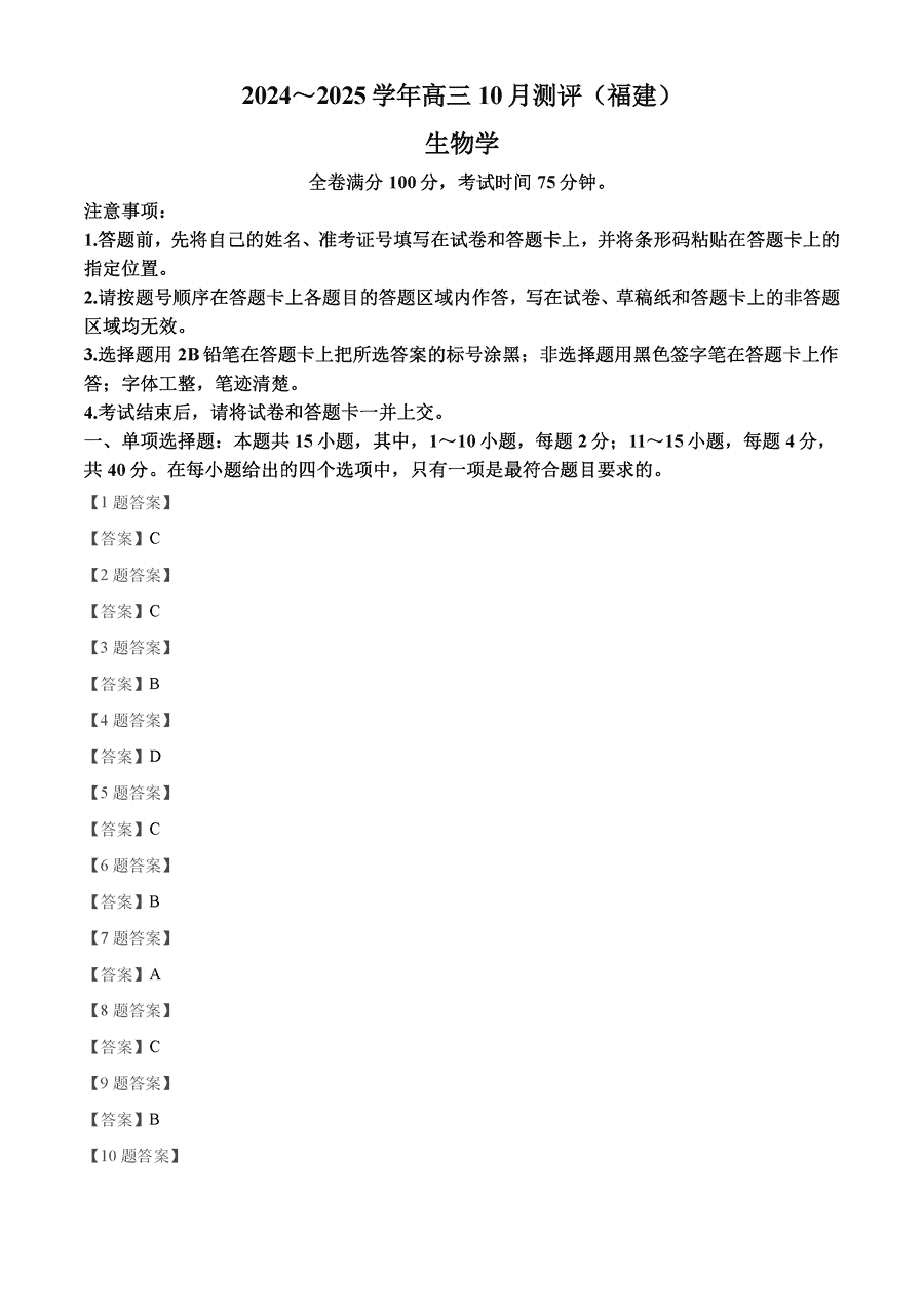 福建百校联考2025届高三上学期10月测评生物试卷及参考答案