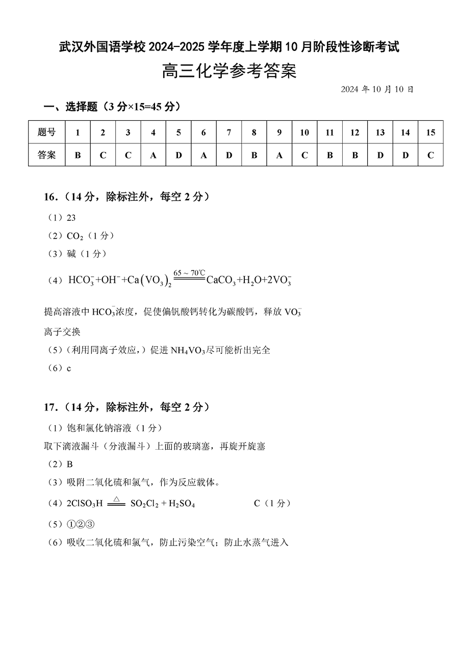 导读武汉外国语学校2025届高三上学期10月月考化学试题质量较高,题型多样,将作为考察考生对相应考点的掌握程度,考后将及时整理试题及答案解析相关信息,以供考生学习交流!化学试题及答案解析