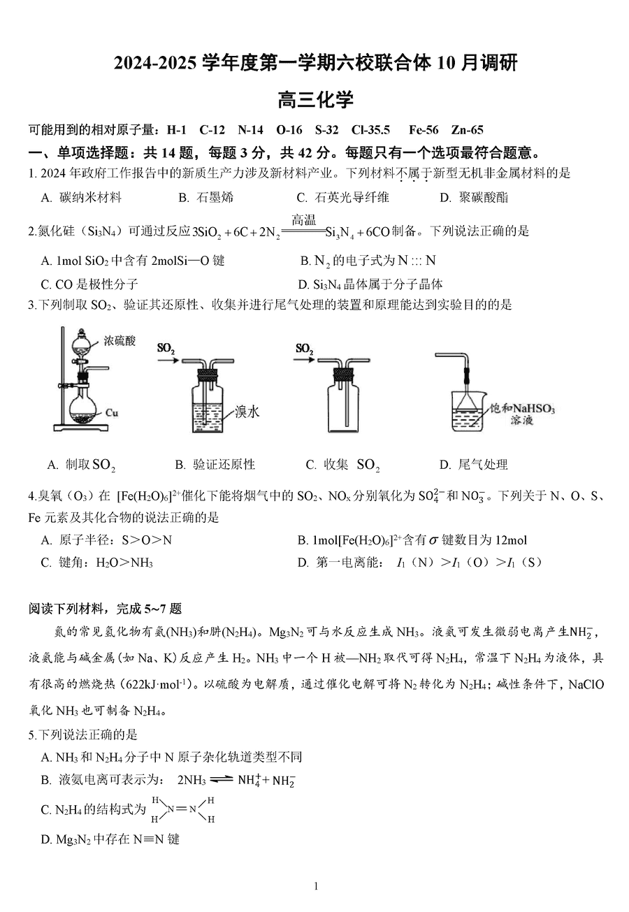 南京六校联合体2024-2025学年高三上学期10月期中调研化学试题质量较高,题型多样,将作为考察考生对相应考点的掌握程度,考后将及时整理试题及答案解析相关信息,以供考生学习交流!