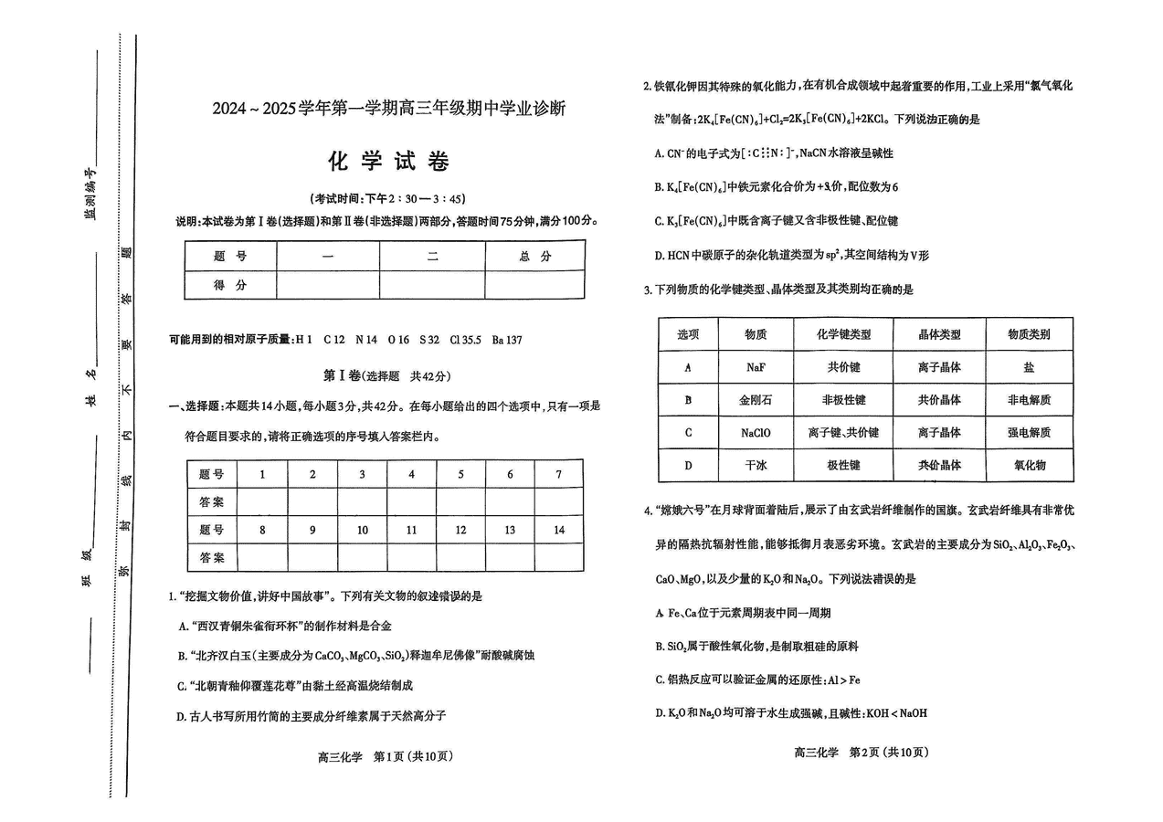 太原市2024-2025学年高三上学期期中化学试题质量较高,题型多样,将作为考察考生对相应考点的掌握程度,考后将及时整理试题及答案解析相关信息,以供考生学习交流!