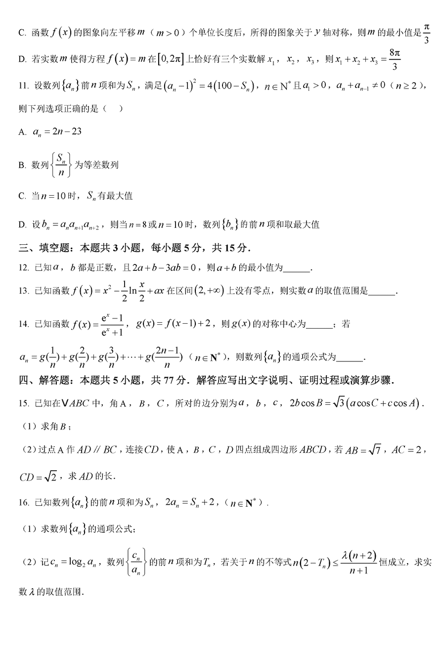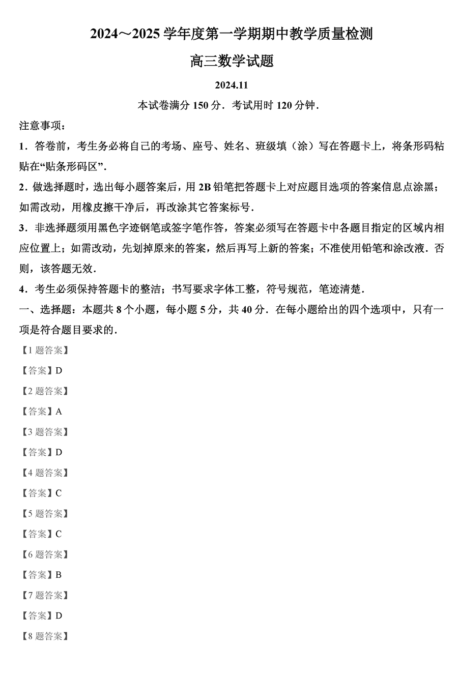 山东济宁2024-2025学年高三上学期期中数学试题质量较高,题型多样,将作为考察考生对相应考点的掌握程度,考后将及时整理试题及答案解析相关信息,以供考生学习交流!