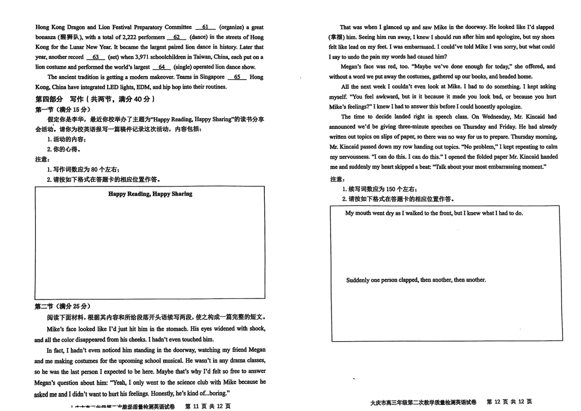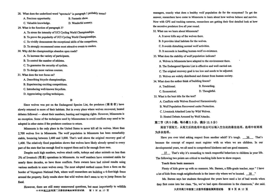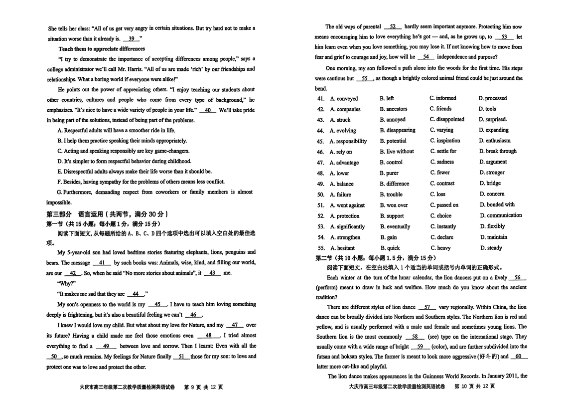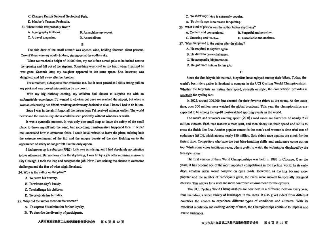黑龙江大庆二模2025届高三年级第二次教学质检英语试题质量较高,题型多样,将作为考察考生对相应考点的掌握程度,考后将及时整理试题及答案解析相关信息,以供考生学习交流!