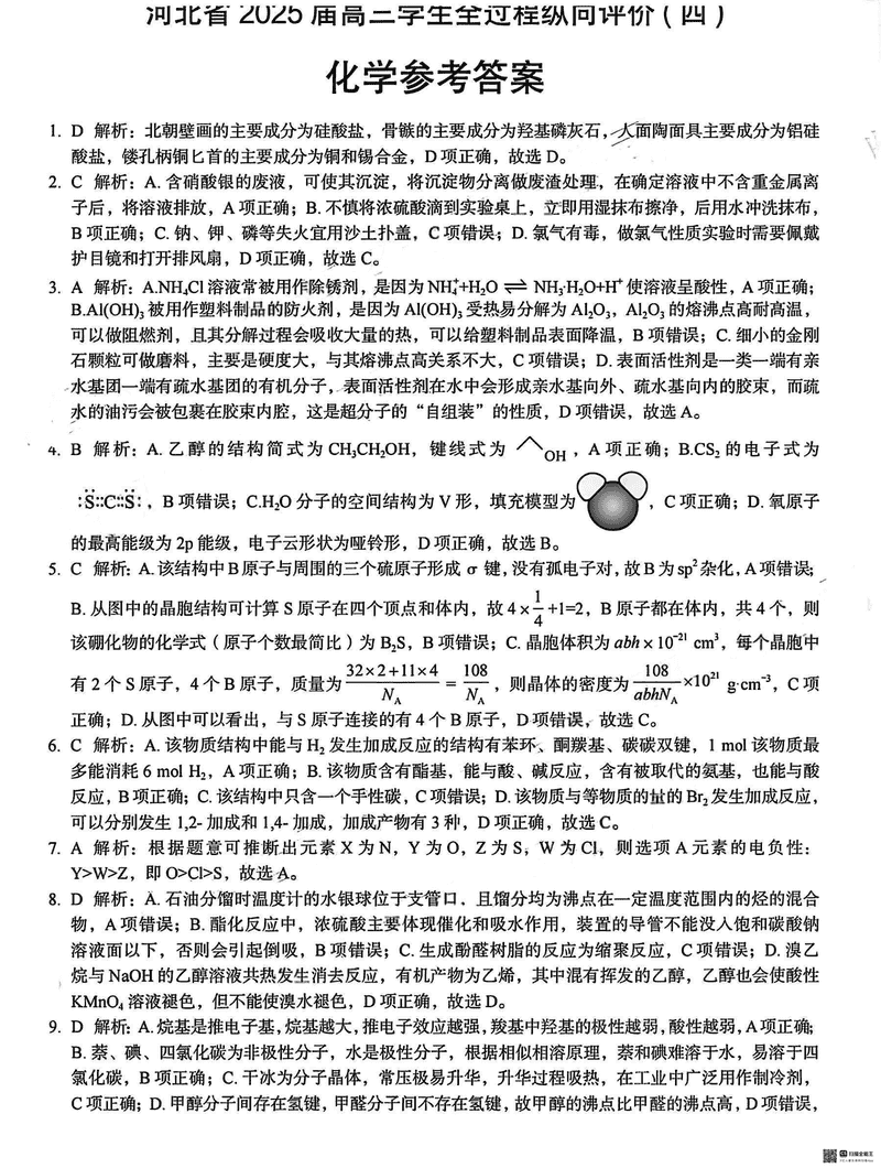 河北省2025届高三学生全过程纵向评价(四)化学试题质量较高,题型多样,将作为考察考生对相应考点的掌握程度,考后将及时整理试题及答案解析相关信息,以供考生学习交流!