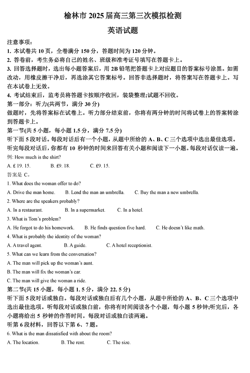 咸阳市2025年高考模拟检测(二)英语试题质量较高,题型多样,将作为考察考生对相应考点的掌握程度,考后将及时整理试题及答...