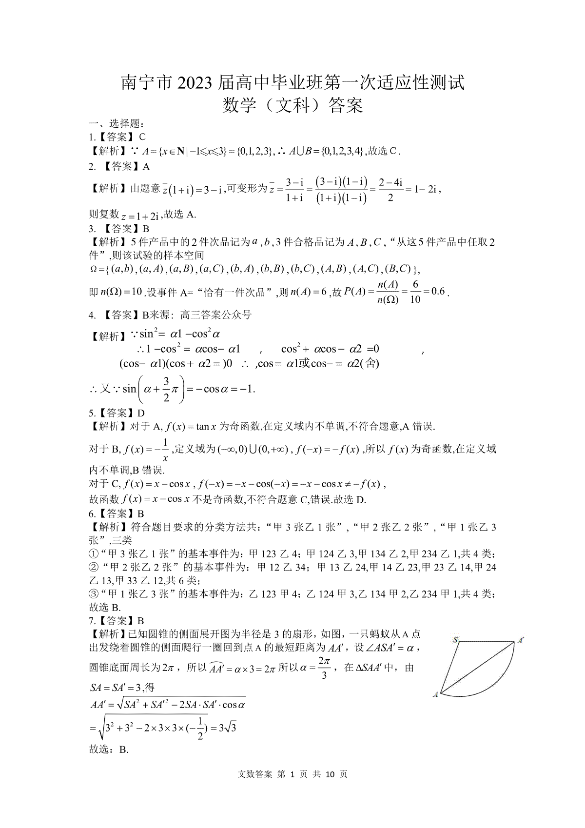 南宁市2023 届高中毕业班第一次适应性测试文数答案