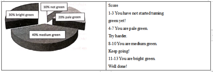 More and more people, both young and old, are becoming greener today. This means they are trying to protect the environment. The students from Group 1, in Sunshine School answered a questionnaire(调查表). The average score for Group I is 8. 3. Then they made a pic chart to show the results.