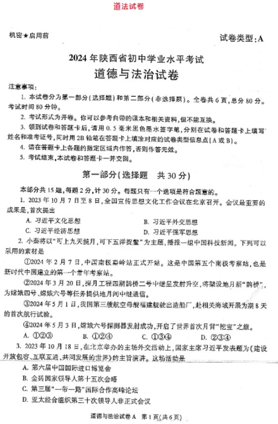 导读大试题为您提供2024年陕西中考道德与法治真题