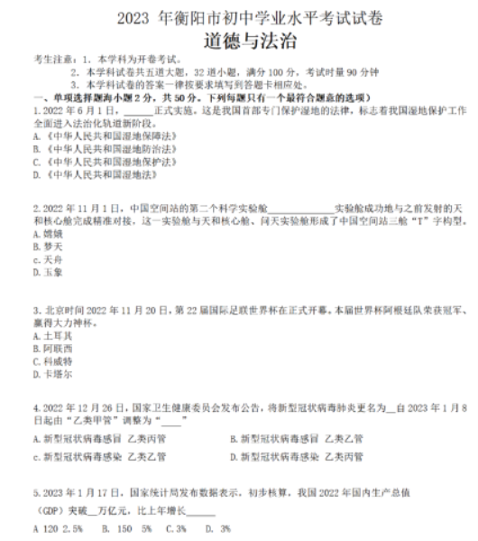 导读大试题为您提供2023年衡阳中考道德与法治真题