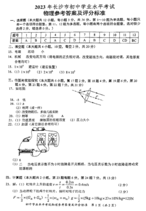 2023年长沙中考物理真题答案