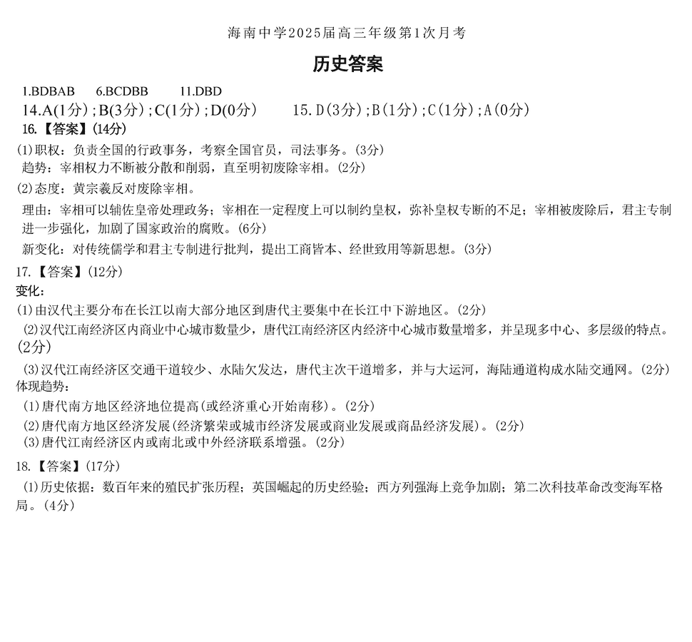 海口海南中学2024-2025学年高三上学期9月月考历史试题质量较高,题型多样,将作为考察考生对相应考点的掌握程度,考后将及时整理试题及答案解析相关信息,以供考生学习交流!