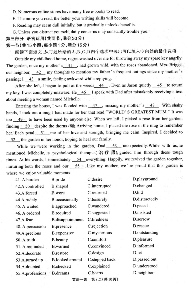 德阳一诊2025届高三第一次诊断英语试题质量较高,题型多样,将作为考察考生对相应考点的掌握程度,考后将及时整理试题及答案解析相关信息,以供考生学习交流!