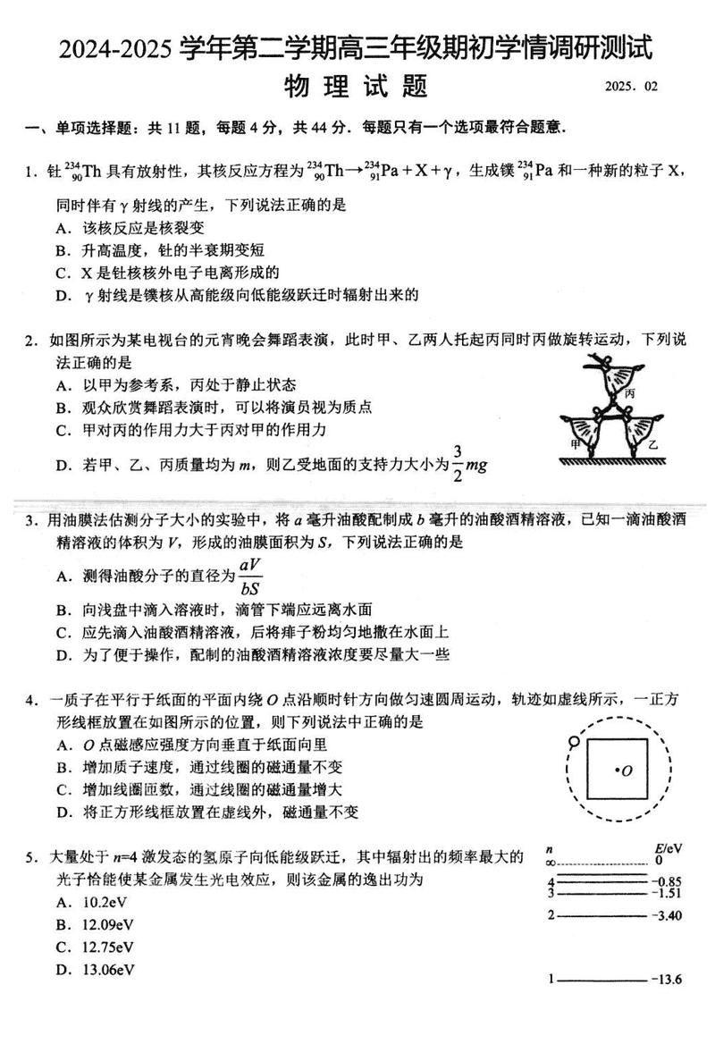 江苏镇江2024-2025学年高三下学期期初质量监测物理试题质量较高,题型多样,将作为考察考生对相应考点的掌握程度,考后将及时整理试题及答案解析相关信息,以供考生学习交流!