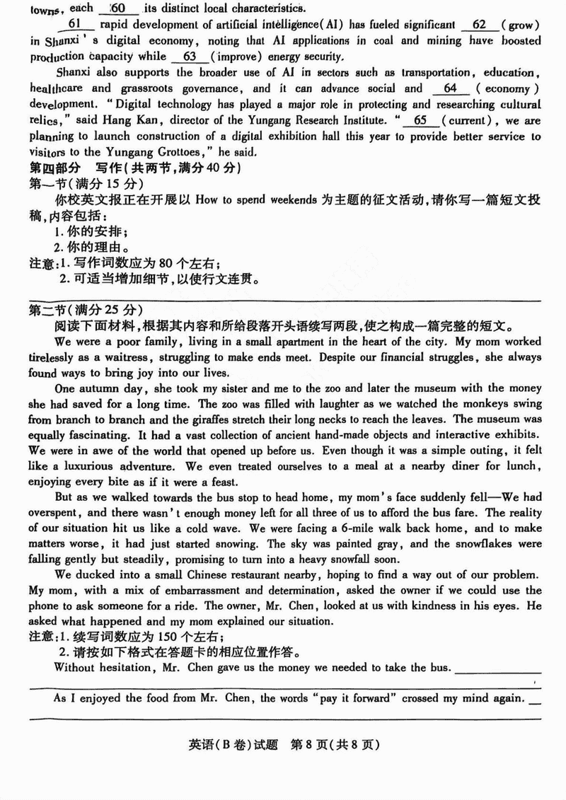 晋中三模2025年5月高考适应训练英语试题质量较高,题型多样,将作为考察考生对相应考点的掌握程度,考后将及时整理试题及答案解析相关信息,以供考生学习交流!
