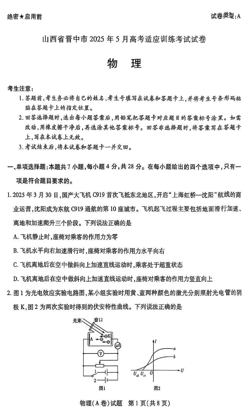 晋中三模2025年5月高考适应训练物理试题质量较高,题型多样,将作为考察考生对相应考点的掌握程度,考后将及时整理试题及答...