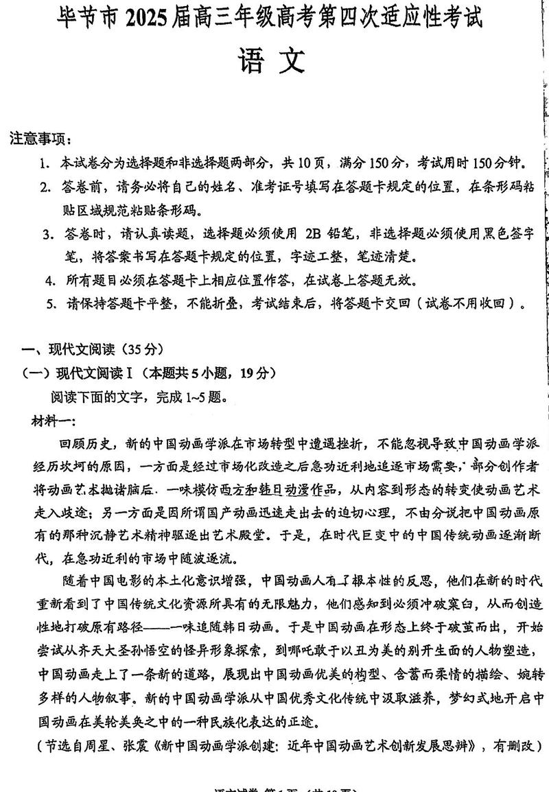 贵州毕节2025届高考第四次适应性考语文试题质量较高,题型多样,将作为考察考生对相应考点的掌握程度,考后将及时整理试题及...