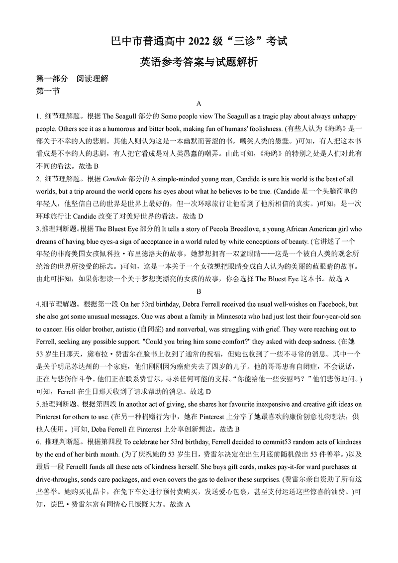 导读巴中市普通高中2025届“三诊”英语试题质量较高,题型多样,将作为考察考生对相应考点的掌握程度,考后将及时整理试题及答案解析相关信息,以供考生学习交流!英语试题及答案解析