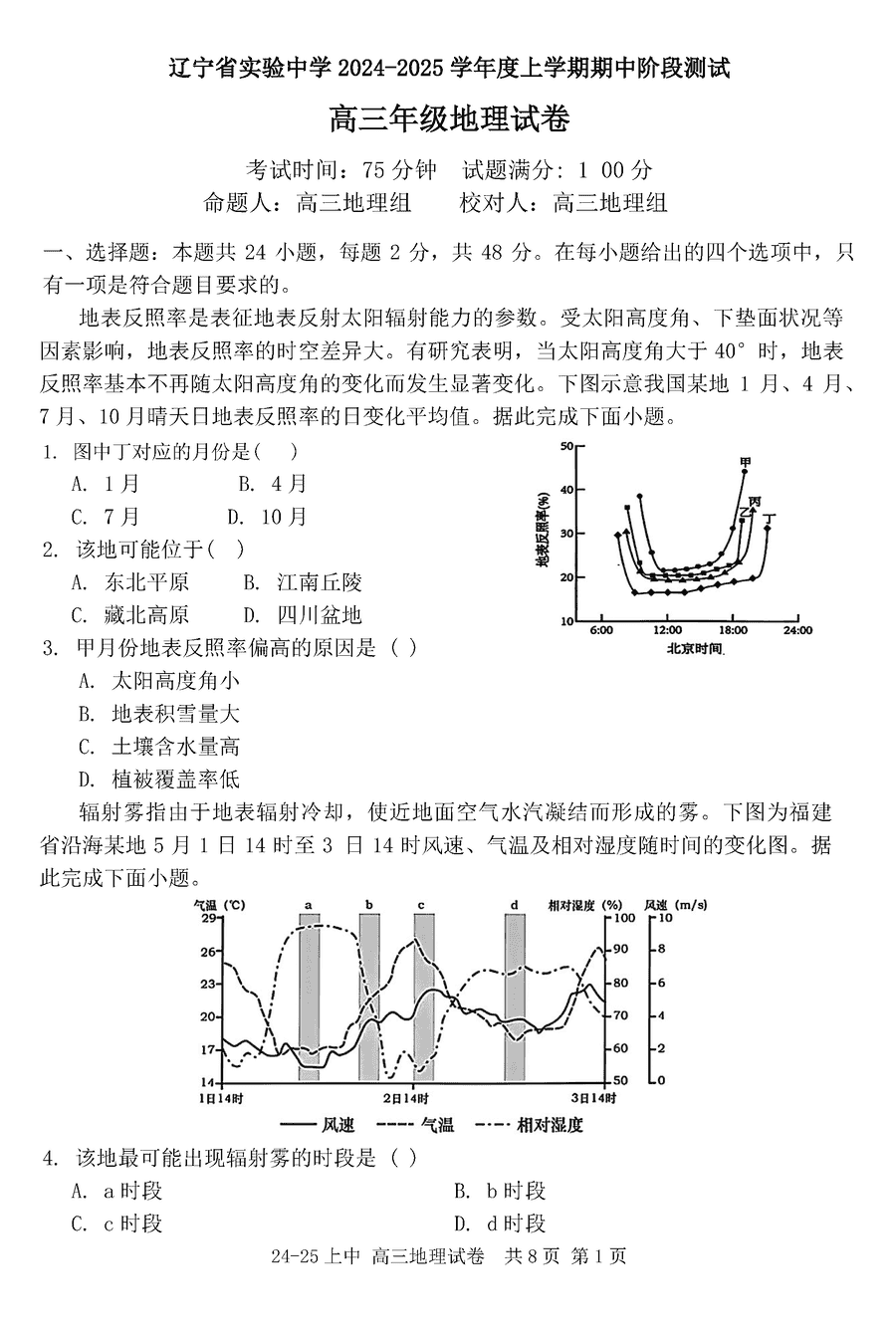辽宁省实验中学2024-2025学年高三上学期期中地理试题质量较高,题型多样,将作为考察考生对相应考点的掌握程度,考后将及时整理试题及答案解析相关信息,以供考生学习交流!