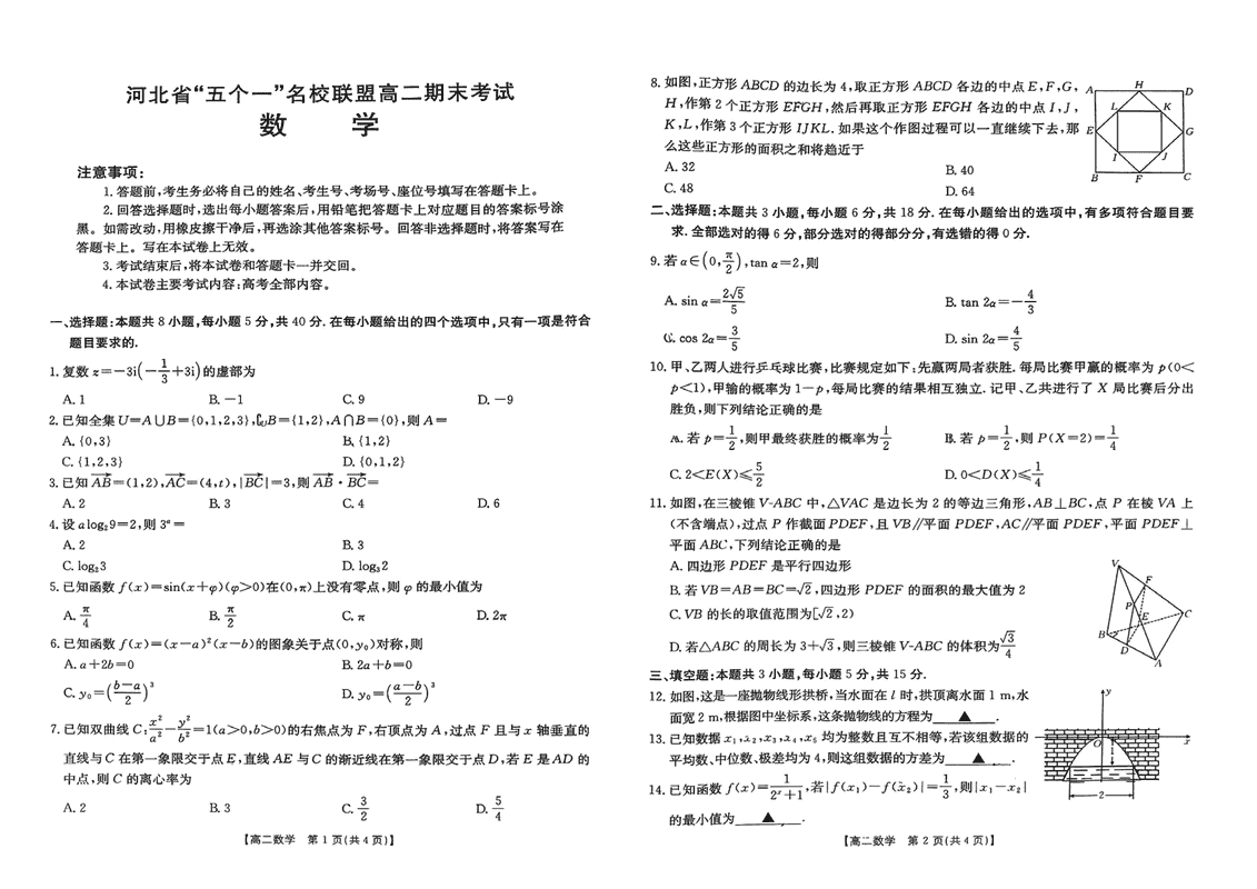 河北“五个一”名校联盟2024-2025学年高二7月期末数学试题质量较高,题型多样,将作为考察考生对相应考点的掌握程度,...