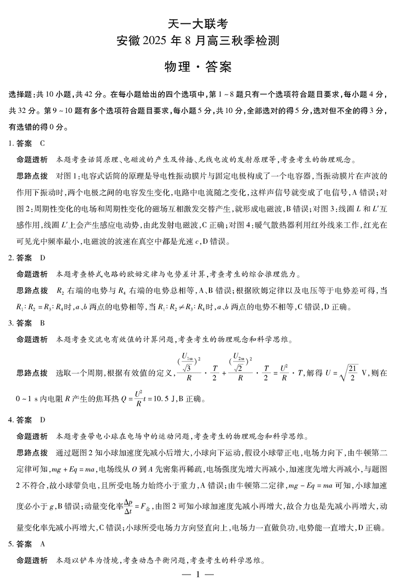 安徽省天一大联考2026届高三8月秋季检测物理试题质量较高,题型多样,将作为考察考生对相应考点的掌握程度,考后将及时整理试题及答案解析相关信息,以供考生学习交流!