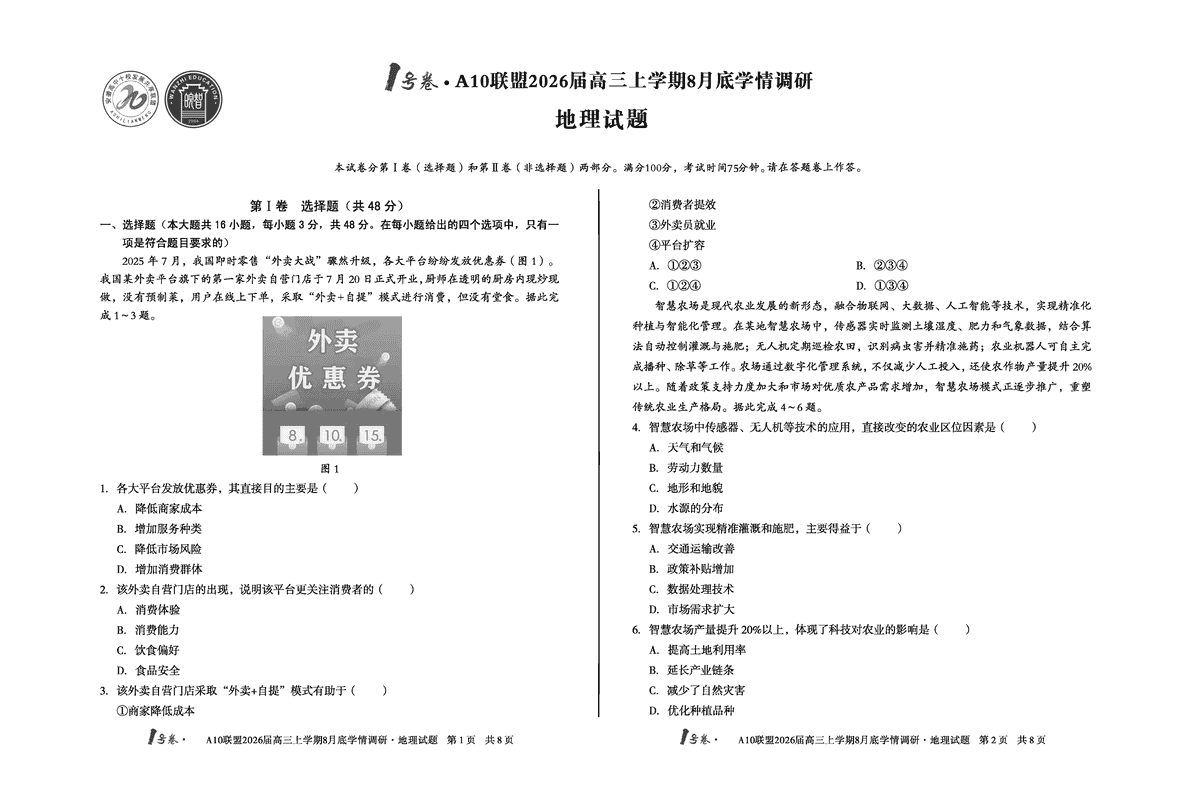 安徽省1号卷·A10联盟2026届高三上学期8月底学情调研地理试题质量较高,题型多样,将作为考察考生对相应考点的掌握程度...