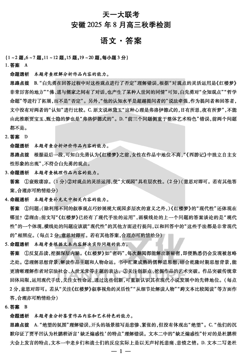 导读安徽省天一大联考2026届高三8月秋季检测语文试题质量较高,题型多样,将作为考察考生对相应考点的掌握程度,考后将及时整理试题及答案解析相关信息,以供考生学习交流!语文试题及答案解析