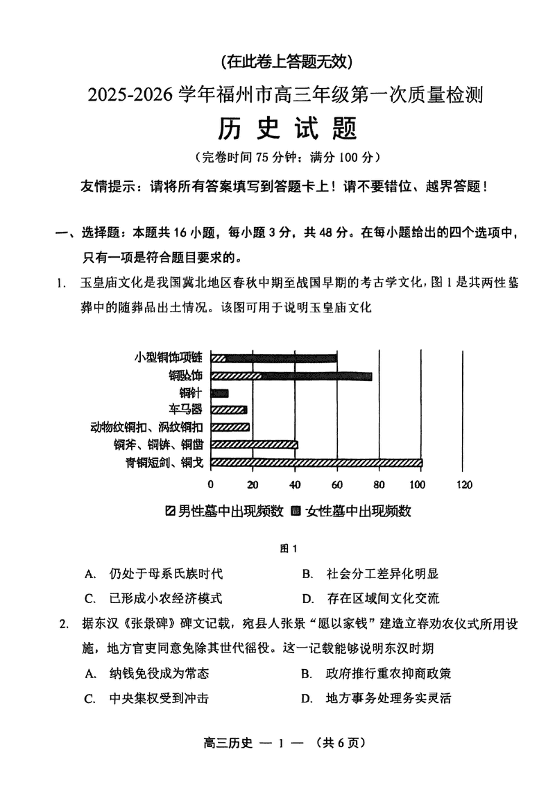 2025-2026学年福州市高三第一次质检历史试题质量较高,题型多样,将作为考察考生对相应考点的掌握程度,考后将及时整理...