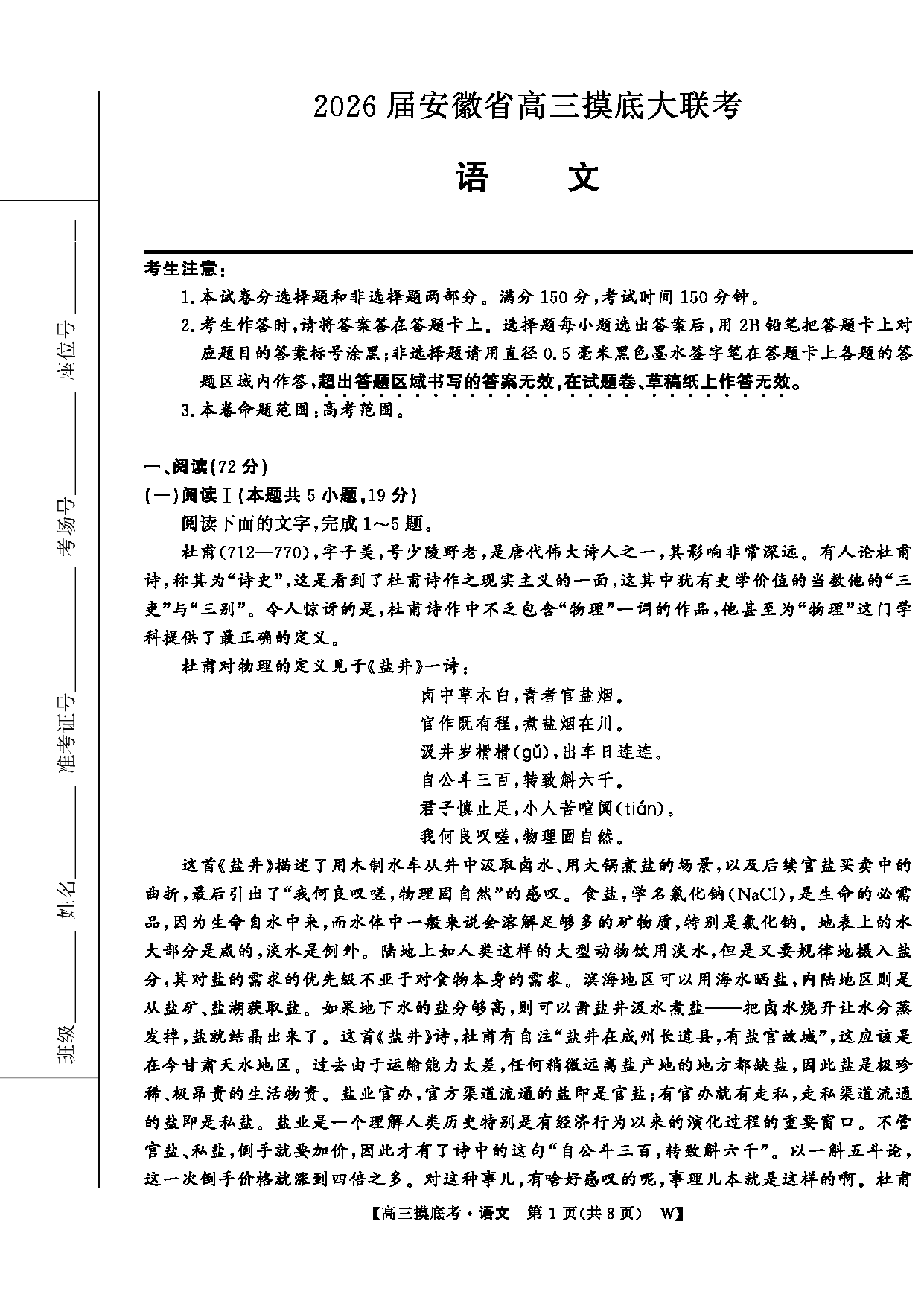 皖南八校2026届高三上学期8月摸底大联考语文试题质量较高,题型多样,将作为考察考生对相应考点的掌握程度,考后将及时整理...
