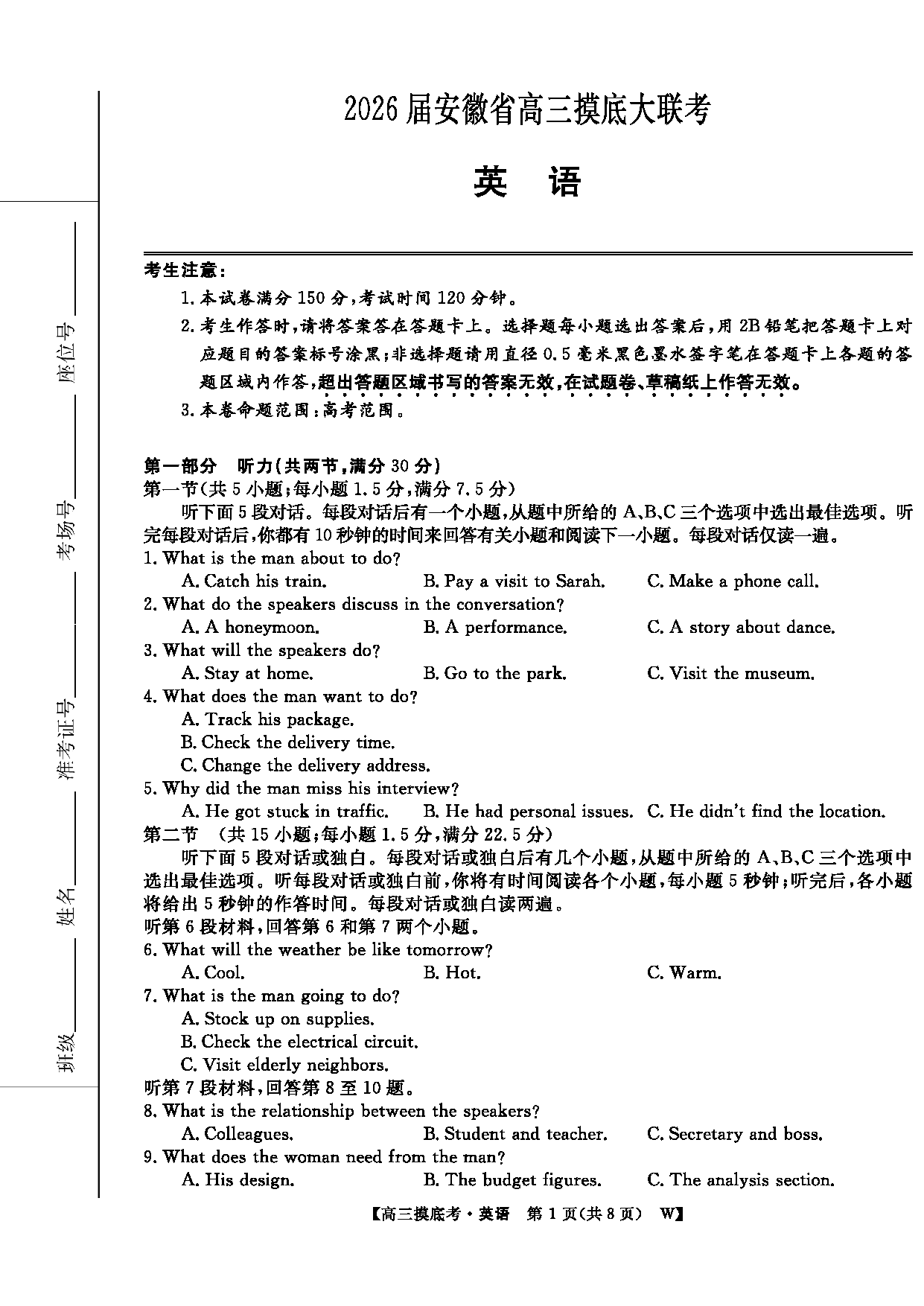 皖南八校2026届高三上学期8月摸底大联考英语试题质量较高,题型多样,将作为考察考生对相应考点的掌握程度,考后将及时整理...