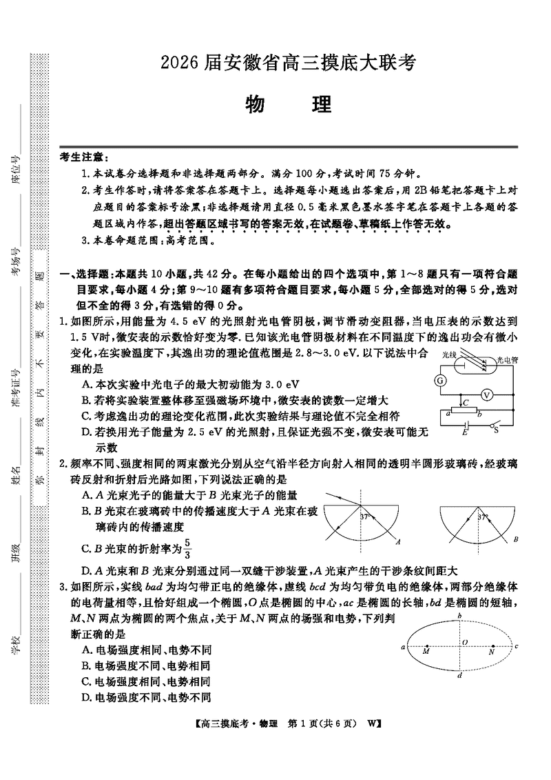 皖南八校2026届高三上学期8月摸底大联考物理试题质量较高,题型多样,将作为考察考生对相应考点的掌握程度,考后将及时整理...