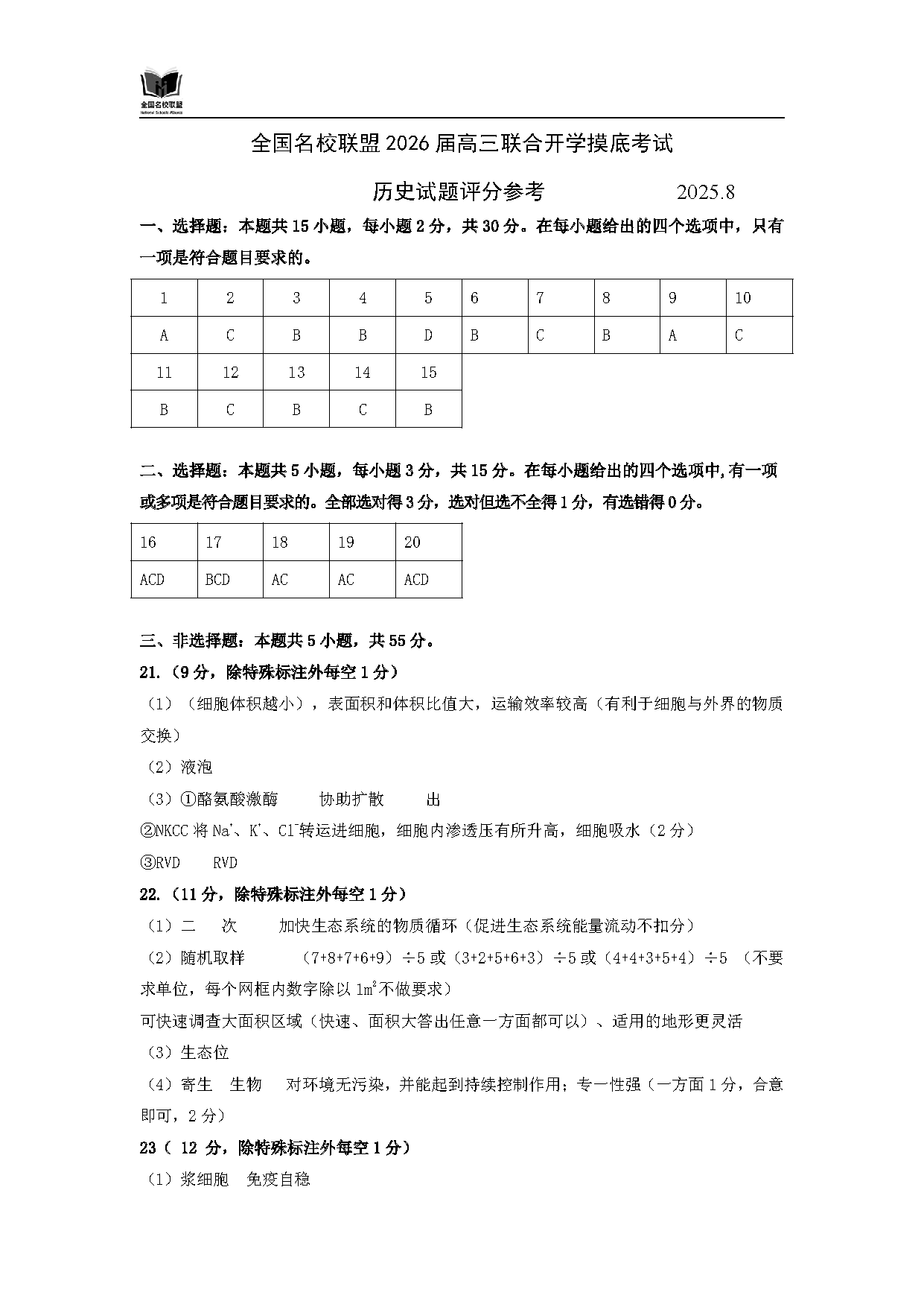 内蒙古-全国名校联盟2026届高三联合开学摸底生物试题质量较高,题型多样,将作为考察考生对相应考点的掌握程度,考后将及时整理试题及答案解析相关信息,以供考生学习交流!