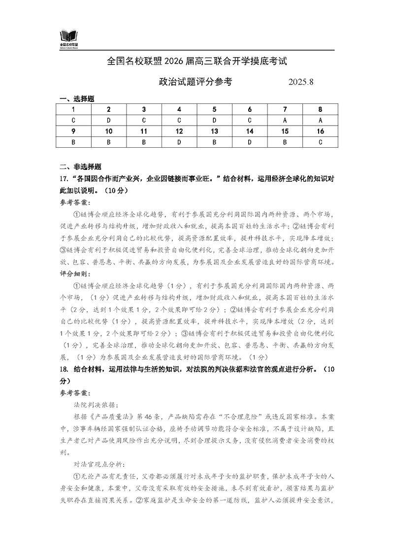 内蒙古-全国名校联盟2026届高三联合开学摸底政治试题质量较高,题型多样,将作为考察考生对相应考点的掌握程度,考后将及时整理试题及答案解析相关信息,以供考生学习交流!