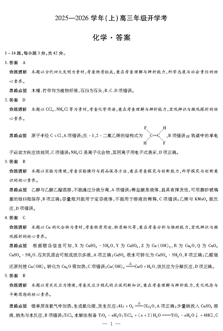 导读河南天一大联考2025-2026学年高三上学期开学考化学试题质量较高,题型多样,将作为考察考生对相应考点的掌握程度,考后将及时整理试题及答案解析相关信息,以供考生学习交流!化学试题及答案解析