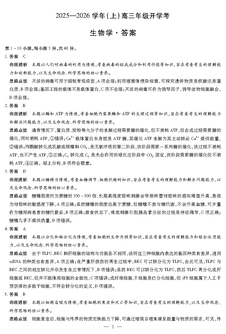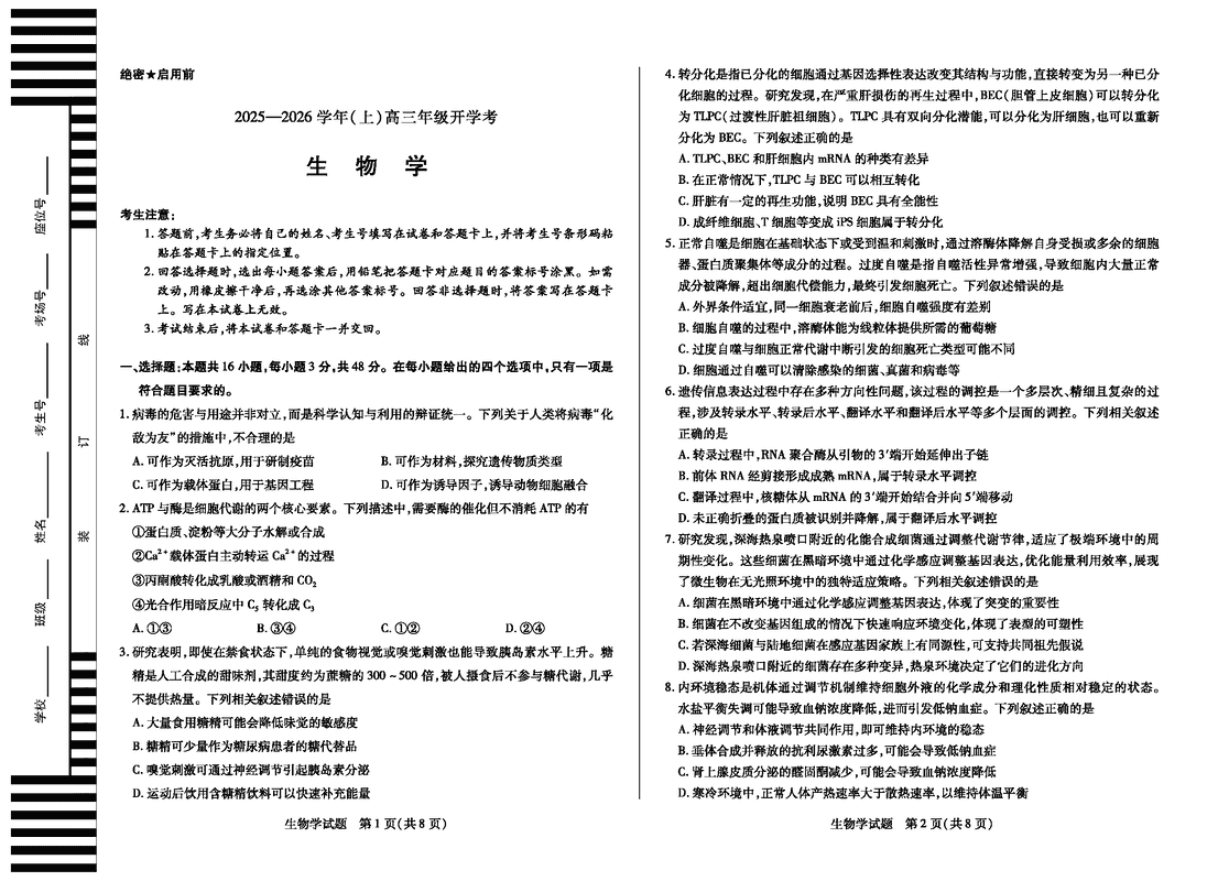 河南天一大联考2025-2026学年高三上学期开学考生物试题质量较高,题型多样,将作为考察考生对相应考点的掌握程度,考后将及时整理试题及答案解析相关信息,以供考生学习交流!