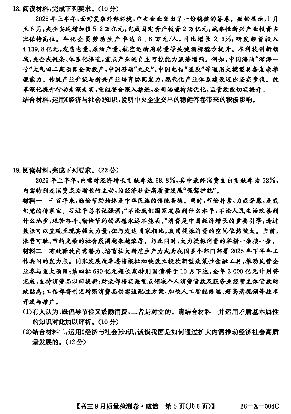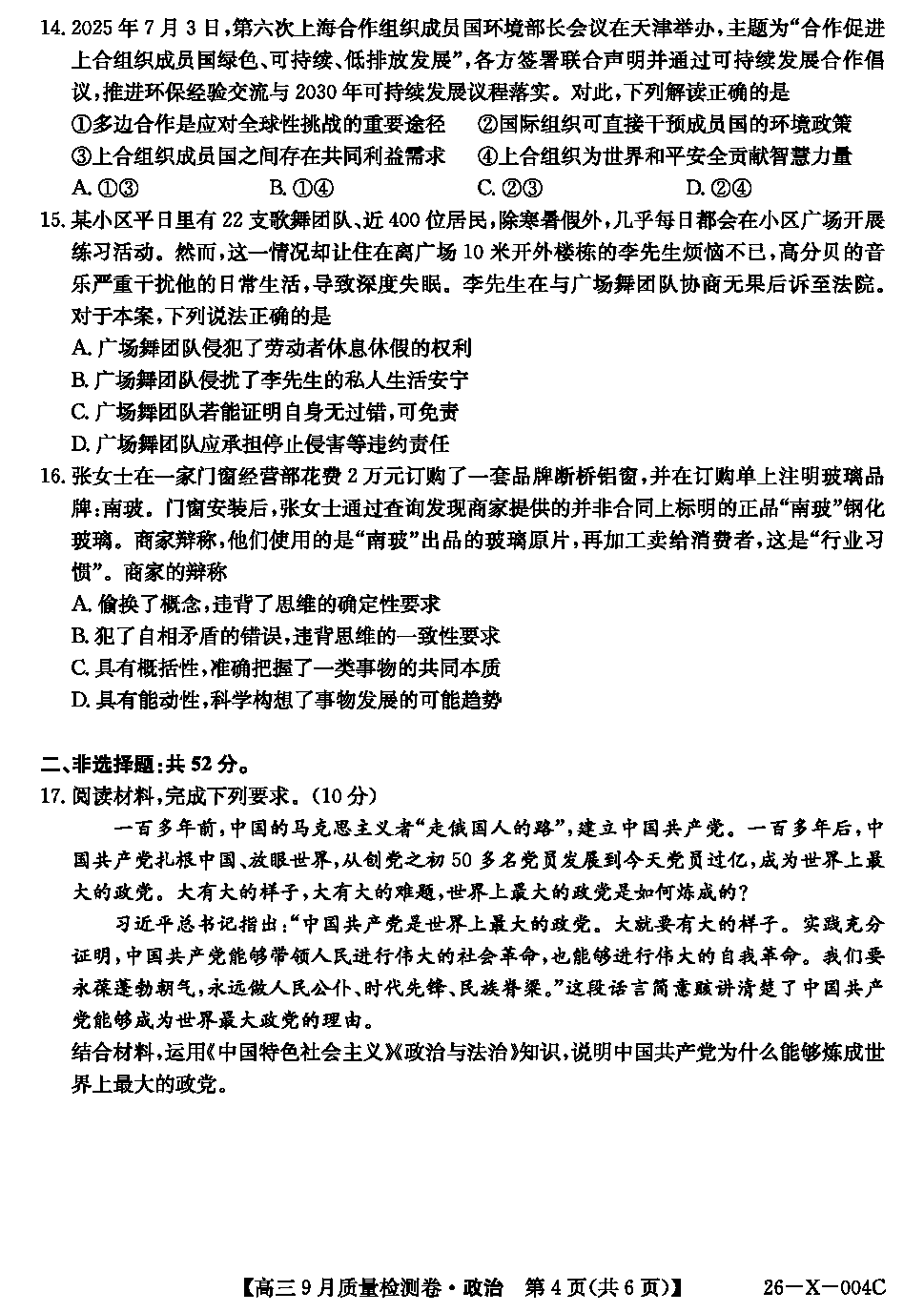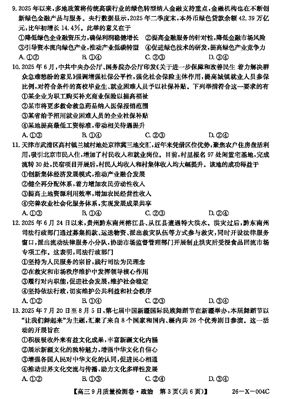导读山西三晋卓越联盟2025-2026学年高三9月质检政治试题质量较高,题型多样,将作为考察考生对相应考点的掌握程度,考后将及时整理试题及答案解析相关信息,以供考生学习交流!政治试题及答案解析