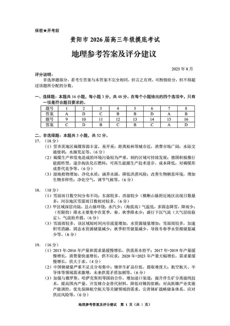 贵阳市、铜仁市2026届高三9月摸底考地理试题质量较高,题型多样,将作为考察考生对相应考点的掌握程度,考后将及时整理试题及答案解析相关信息,以供考生学习交流!