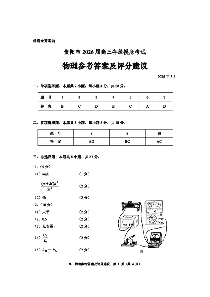 贵阳市、铜仁市2026届高三9月摸底考物理试题质量较高,题型多样,将作为考察考生对相应考点的掌握程度,考后将及时整理试题及答案解析相关信息,以供考生学习交流!