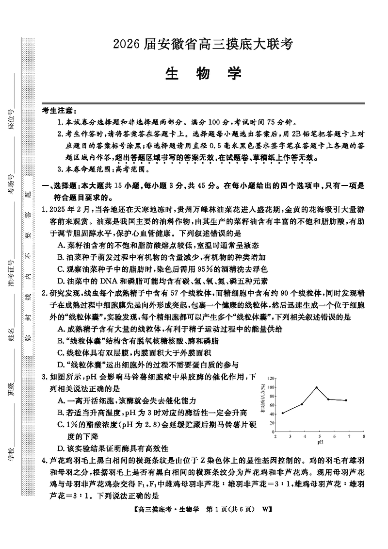 导读皖南八校2026届高三上学期8月摸底大联考生物试题质量较高,题型多样,将作为考察考生对相应考点的掌握程度,考后将及时整理试题及答案解析相关信息,以供考生学习交流!生物试题及答案解析